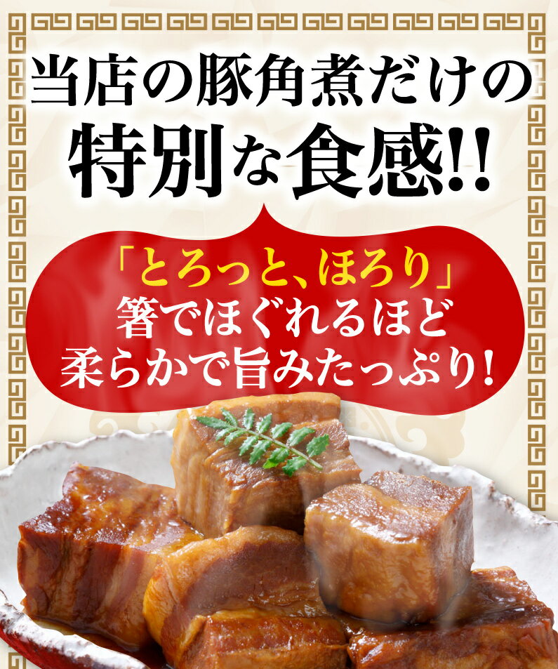 長時間じっくり煮込み余分な脂を抜くことにより、コラーゲンを含んだ良質なゼラチン質が残り、「甘辛くさっぱりした味」「とろっと、ほろり」とした独特の豚角煮です!また冷凍なので長期保存でき、厚切り豚角煮の作りたての美味しさを、解凍するだけで簡単調理が可能です。